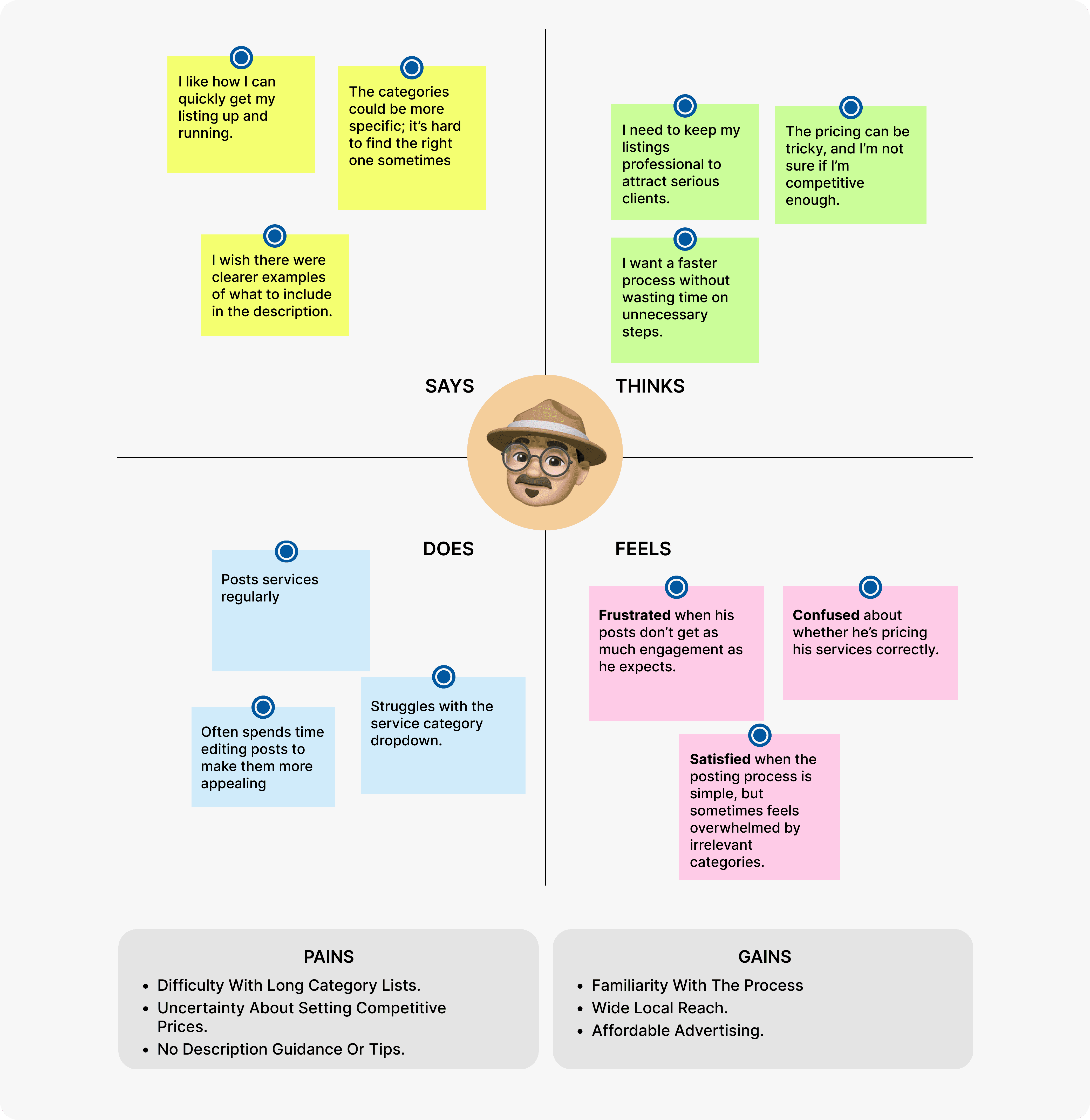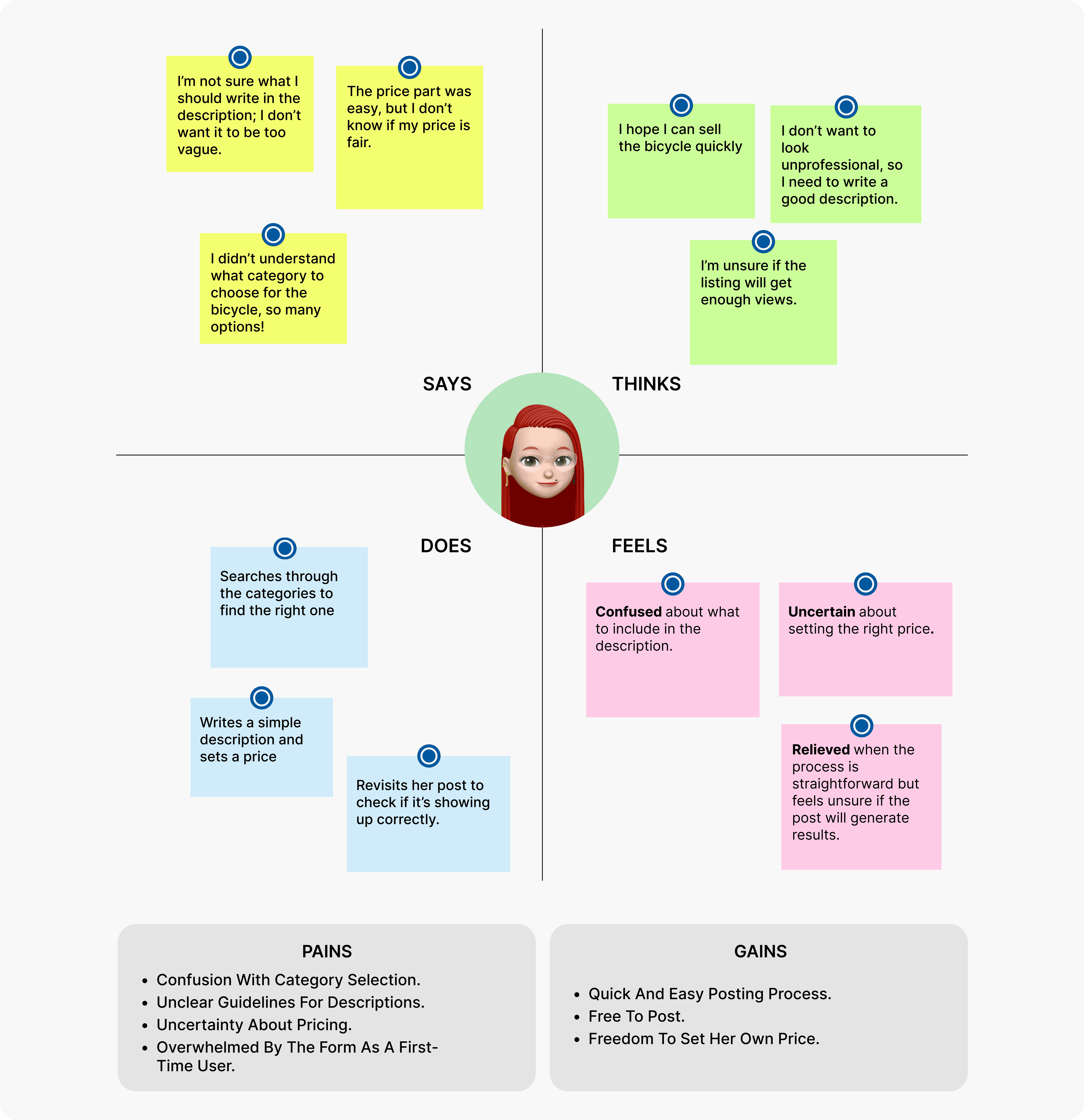 So, I created Empathy Maps based on the user feedback, focusing on their thoughts, feelings, pains, and gains during the posting process. This visualized the users' experience, helping me understand their specific challenges.
