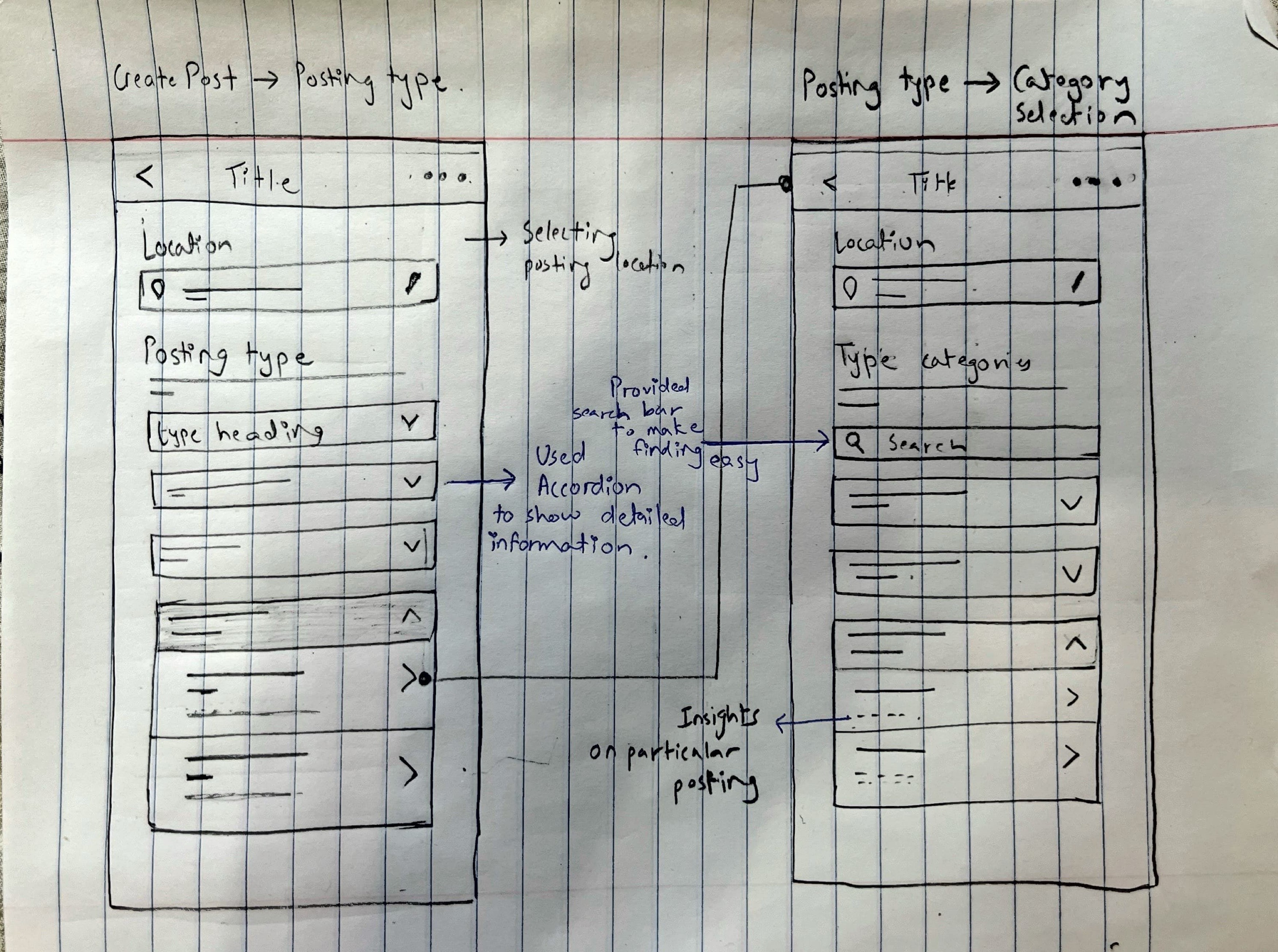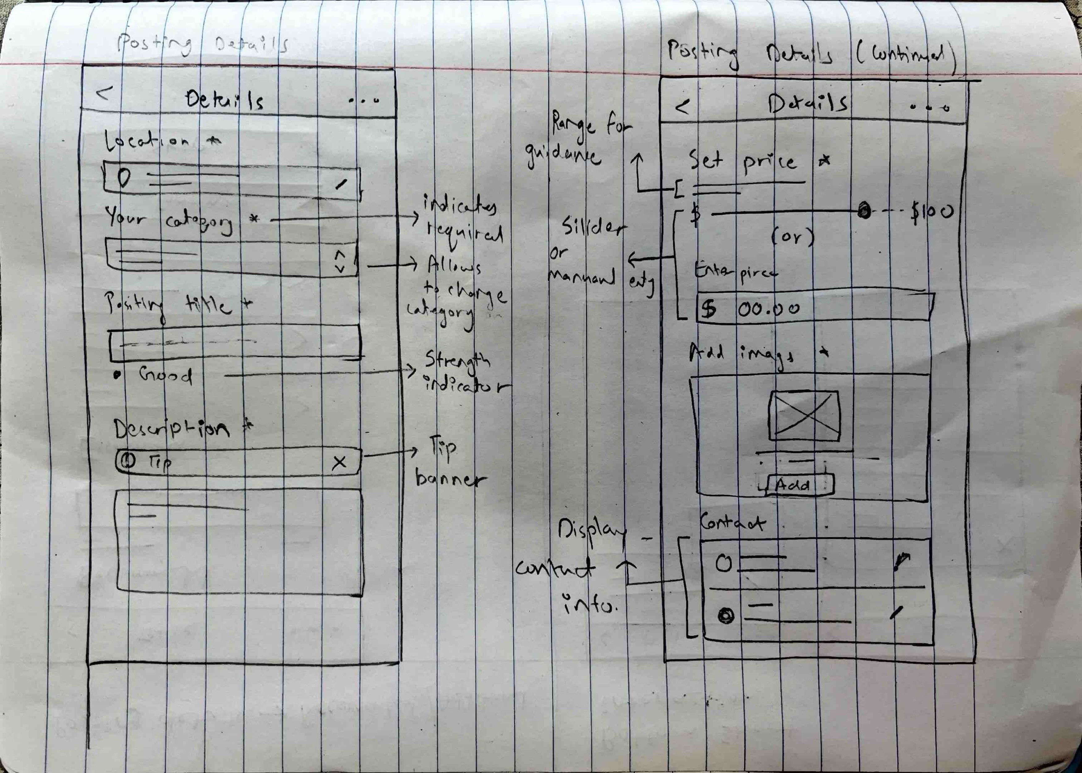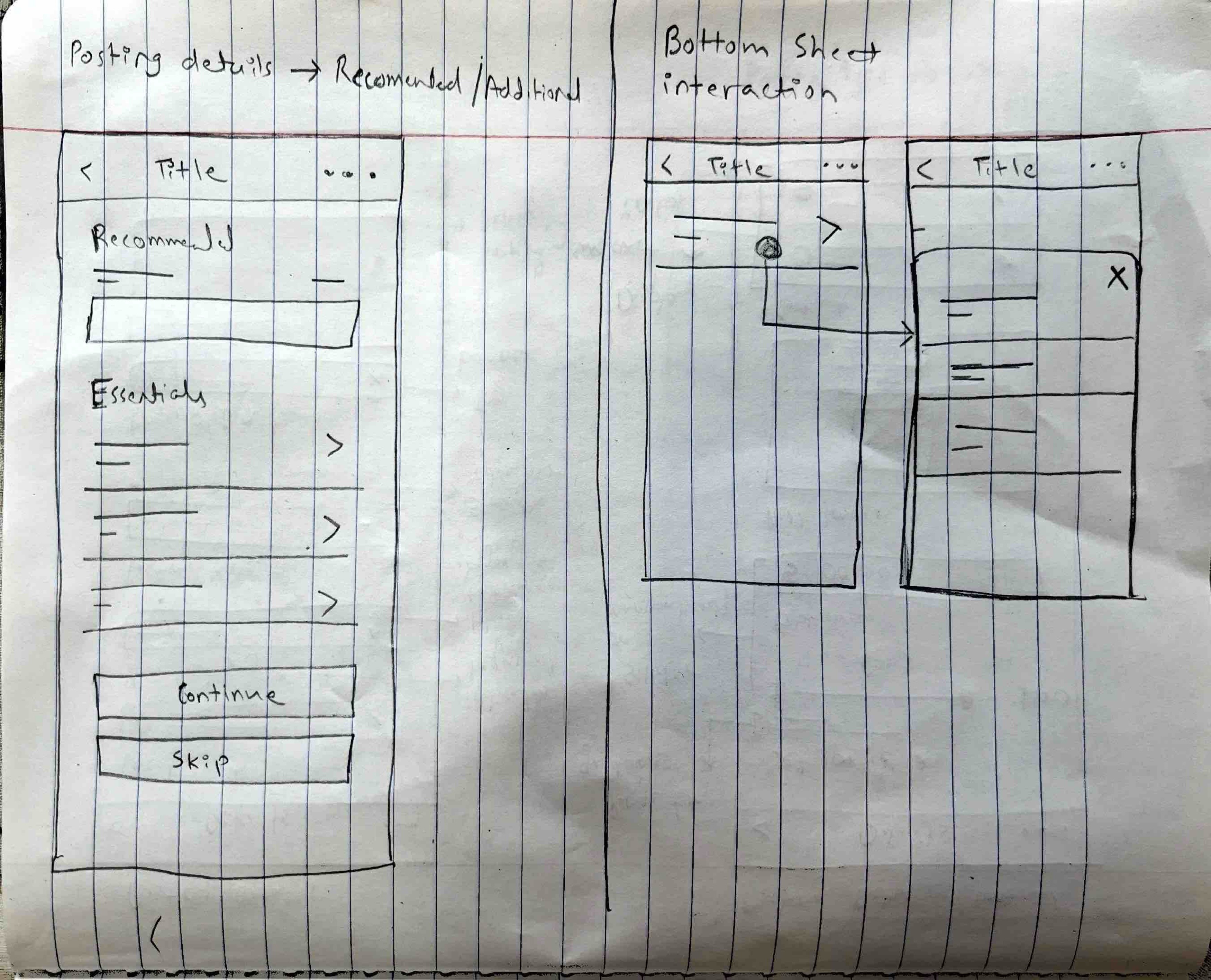 Created rough sketches to visualize potential solutions, focusing on simplifying steps, adding clear instructions, and streamlining the layout. The new design aimed to reduce unnecessary fields, provide inline help, and improve overall navigation. Key solutions included a mobile-first design, refined category selection, and smart suggestions to speed up the process and reduce friction.
