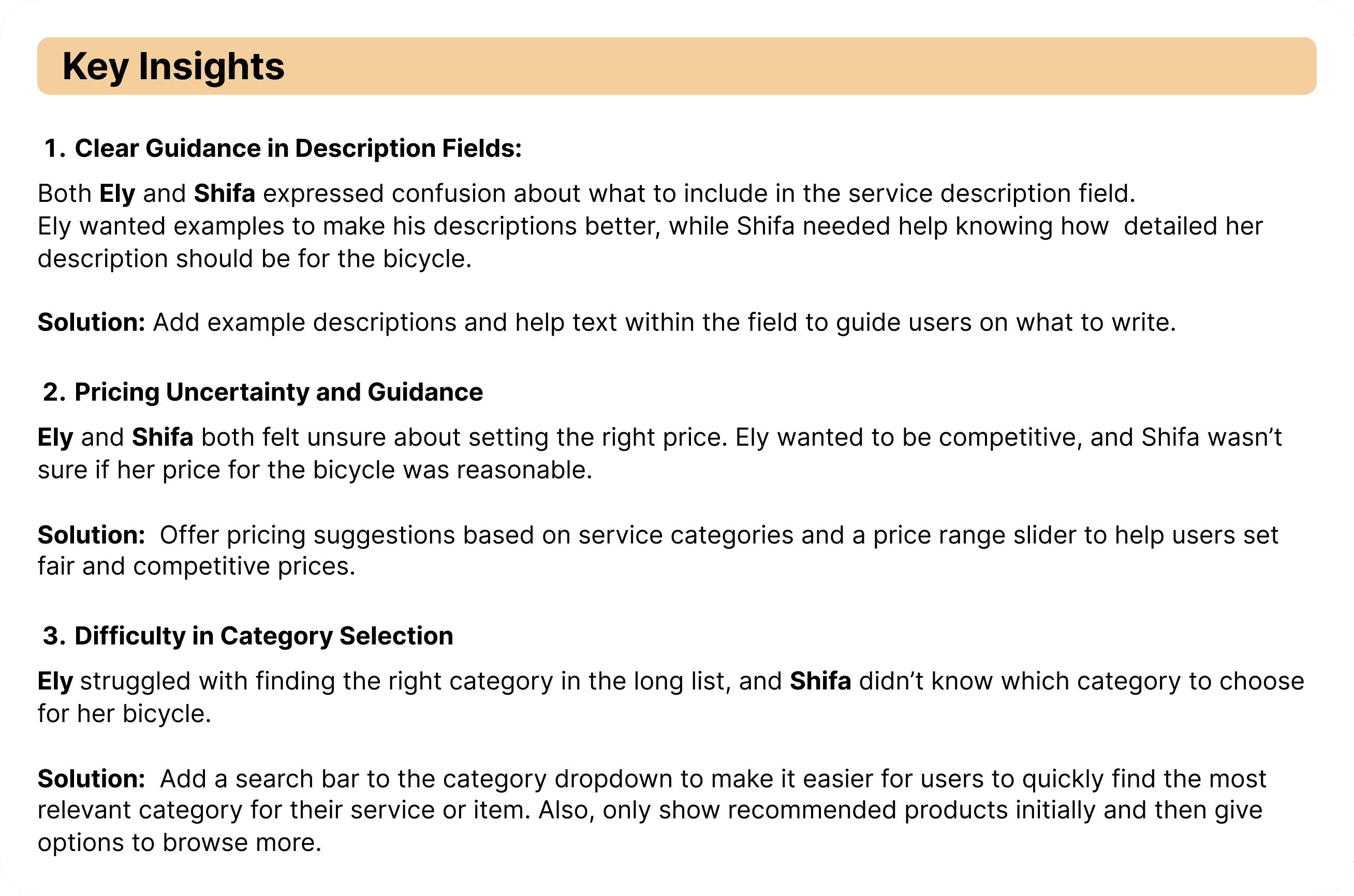 To understand the pain points and improve Craigslist’s service posting flow, I conducted user research with two real users: Ely (an experienced user) and Shifa (a new user with only one listing). The research followed these steps: