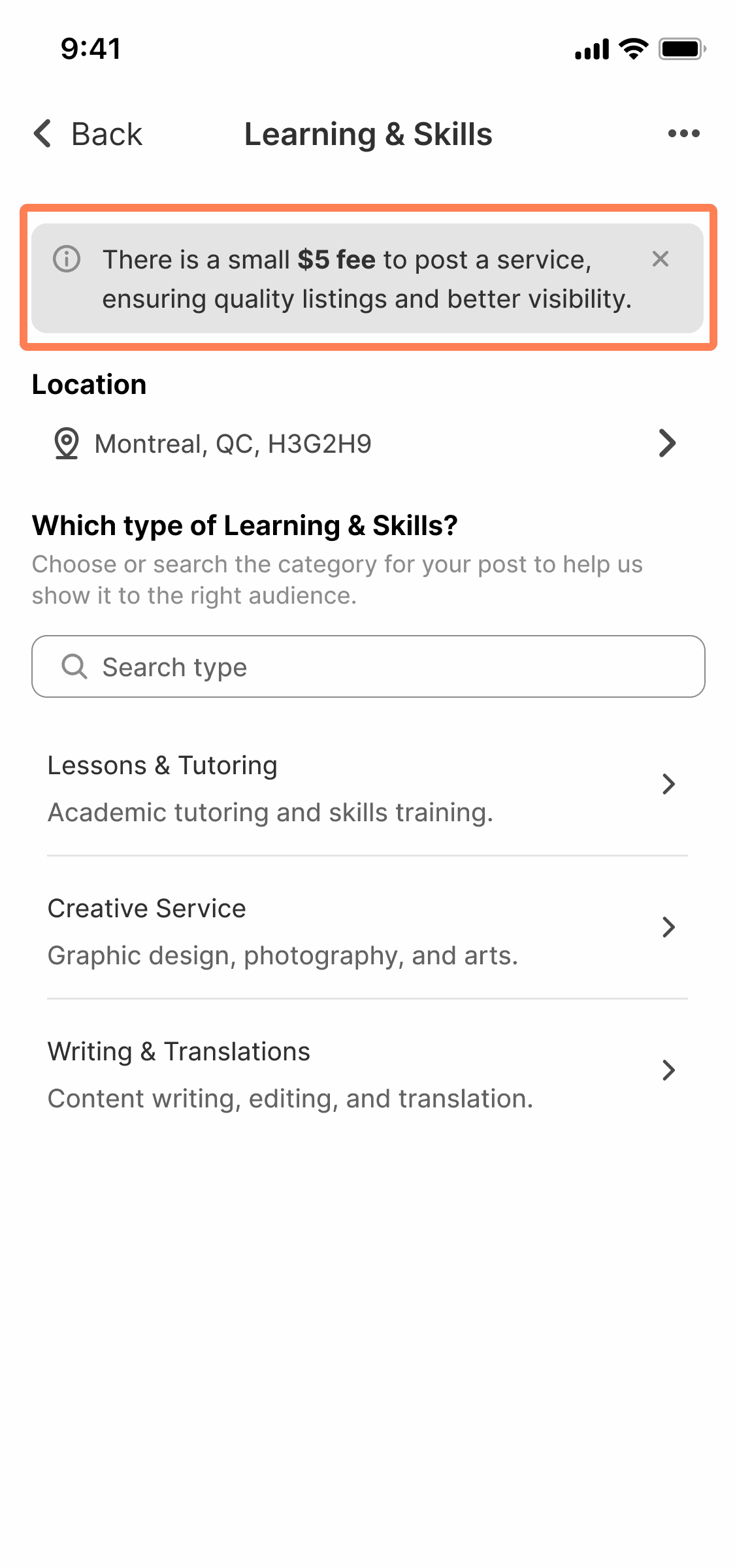 The Services Flow simplifies service posting by grouping related fields into expandable sections and providing clear instructions and notification banners, ensuring users understand the $5 fee and how to fill out the form.