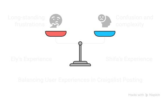 I asked Ely and Shifa about their recent experiences with posting a service on Craigslist. Ely, being an experienced user, provided insight into long-standing frustrations, while Shifa, as a first-time poster, highlighted the confusion and complexity of the process.