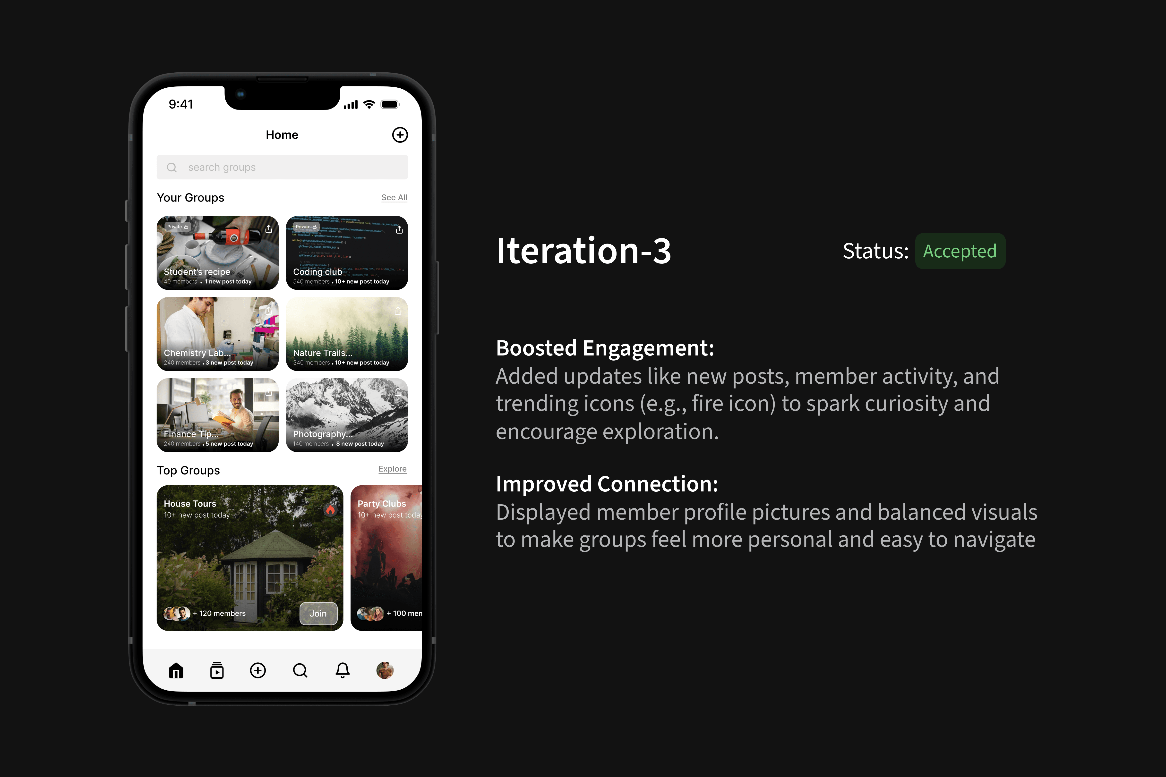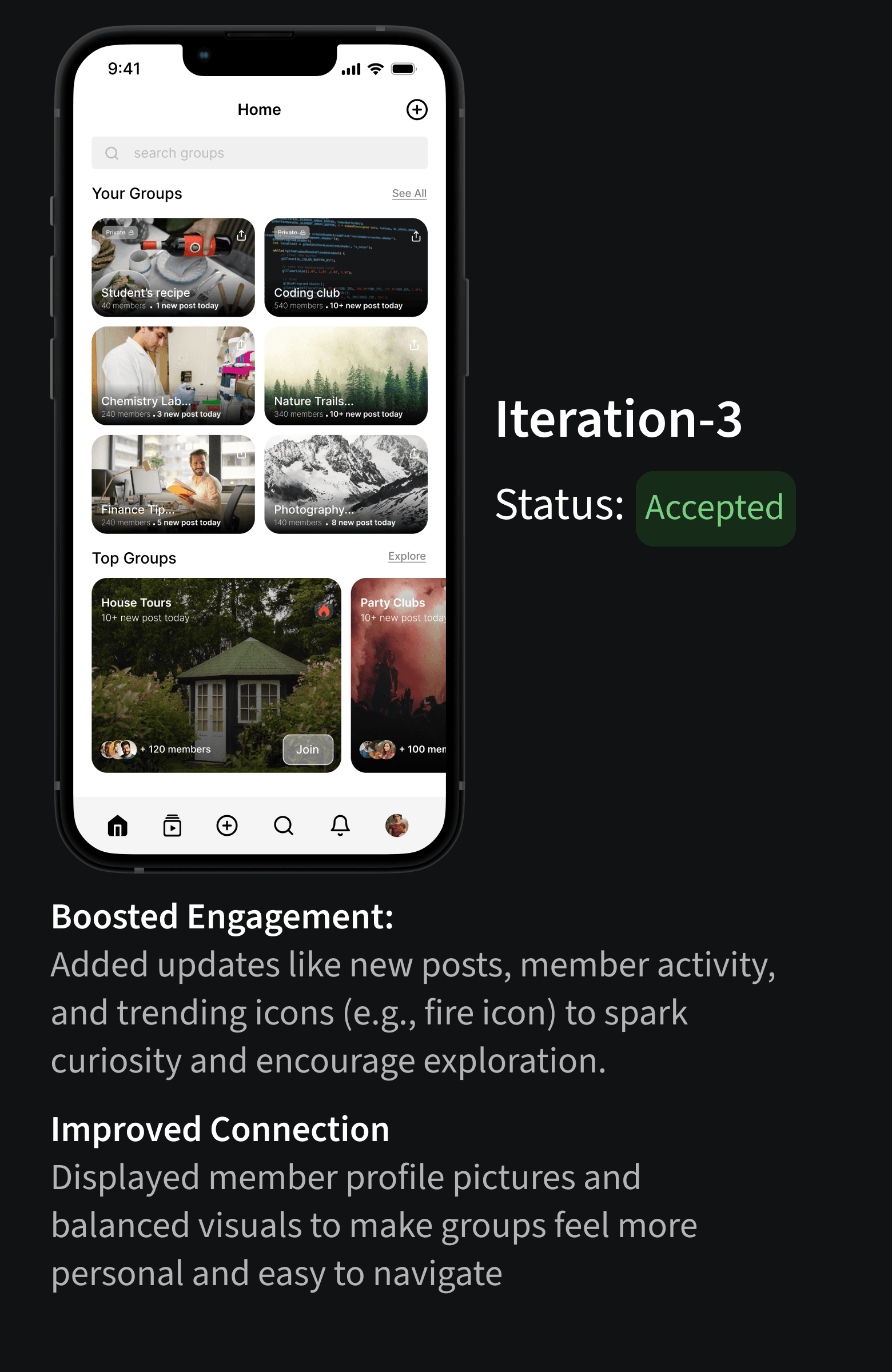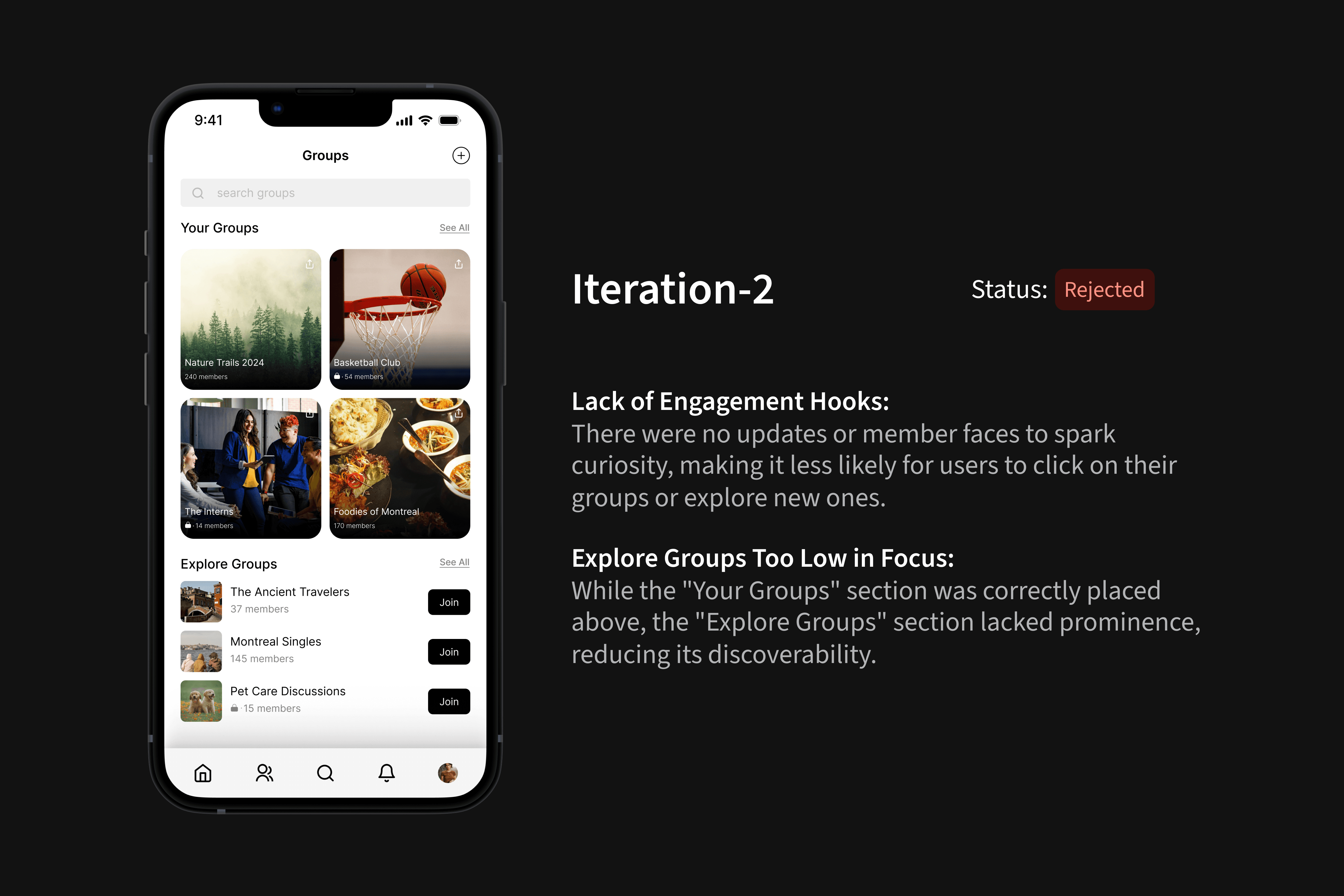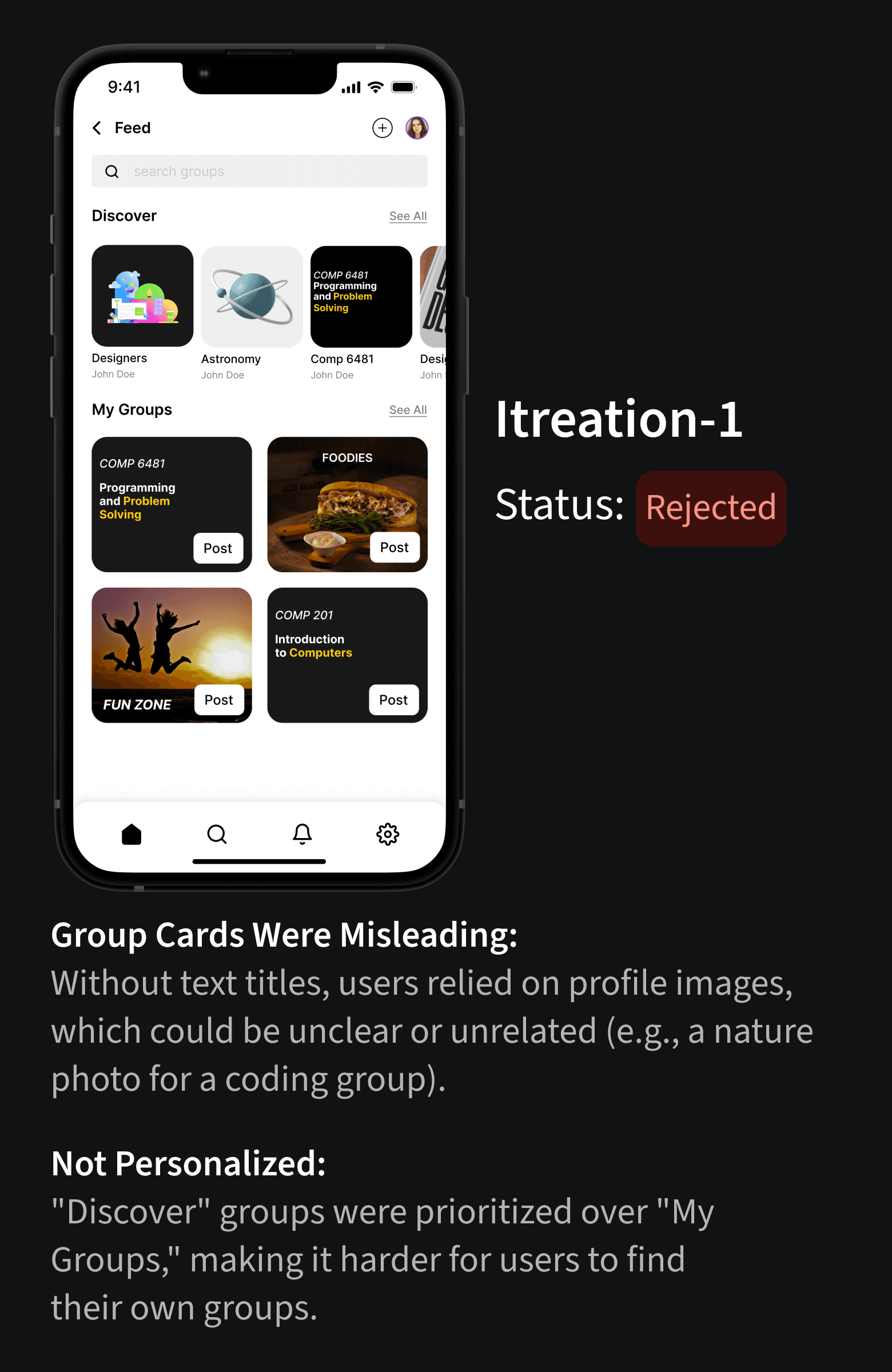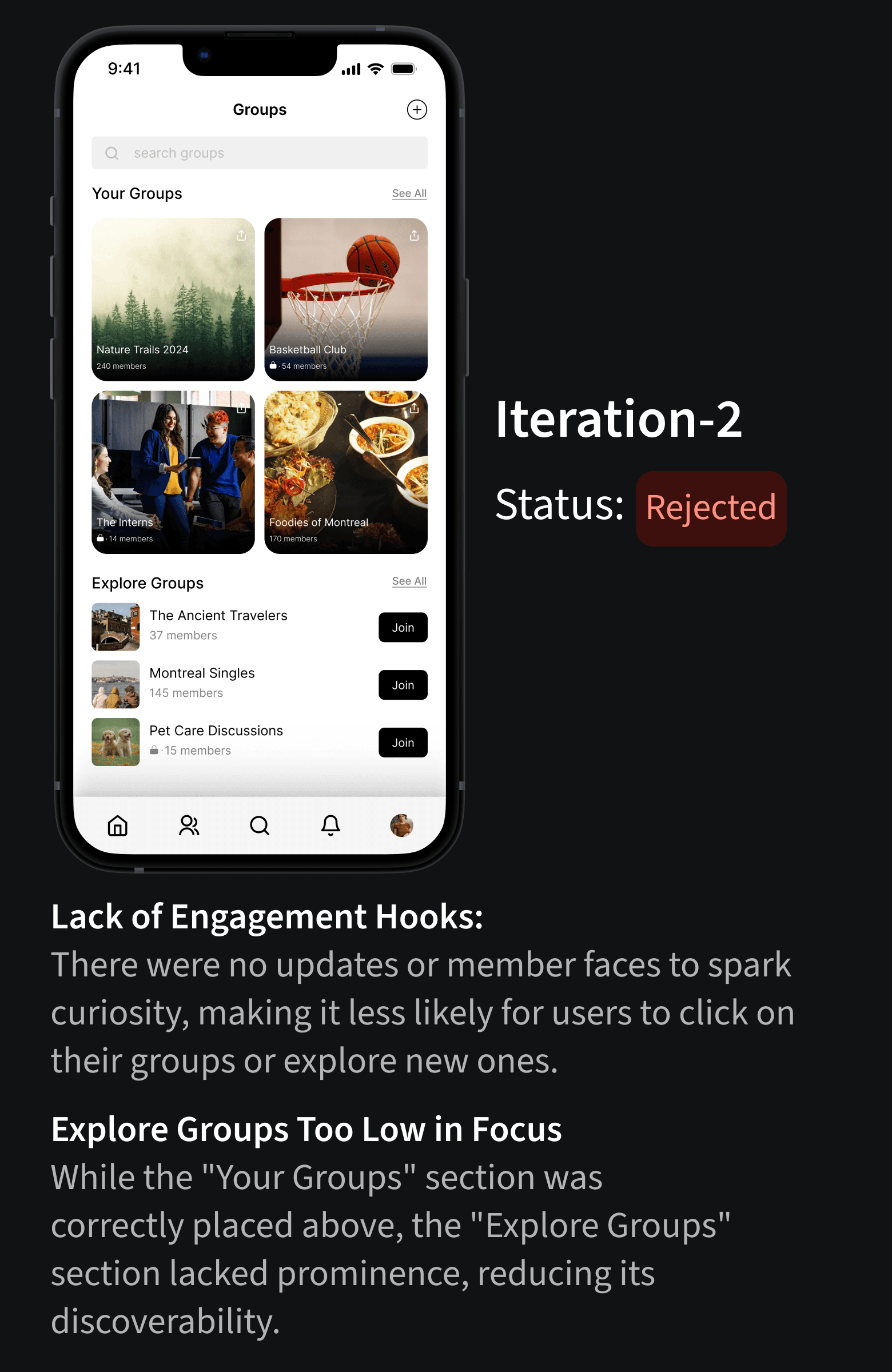 Missing visual hierarchy and unorganized group listings made it difficult for users to locate relevant or joined groups quickly.